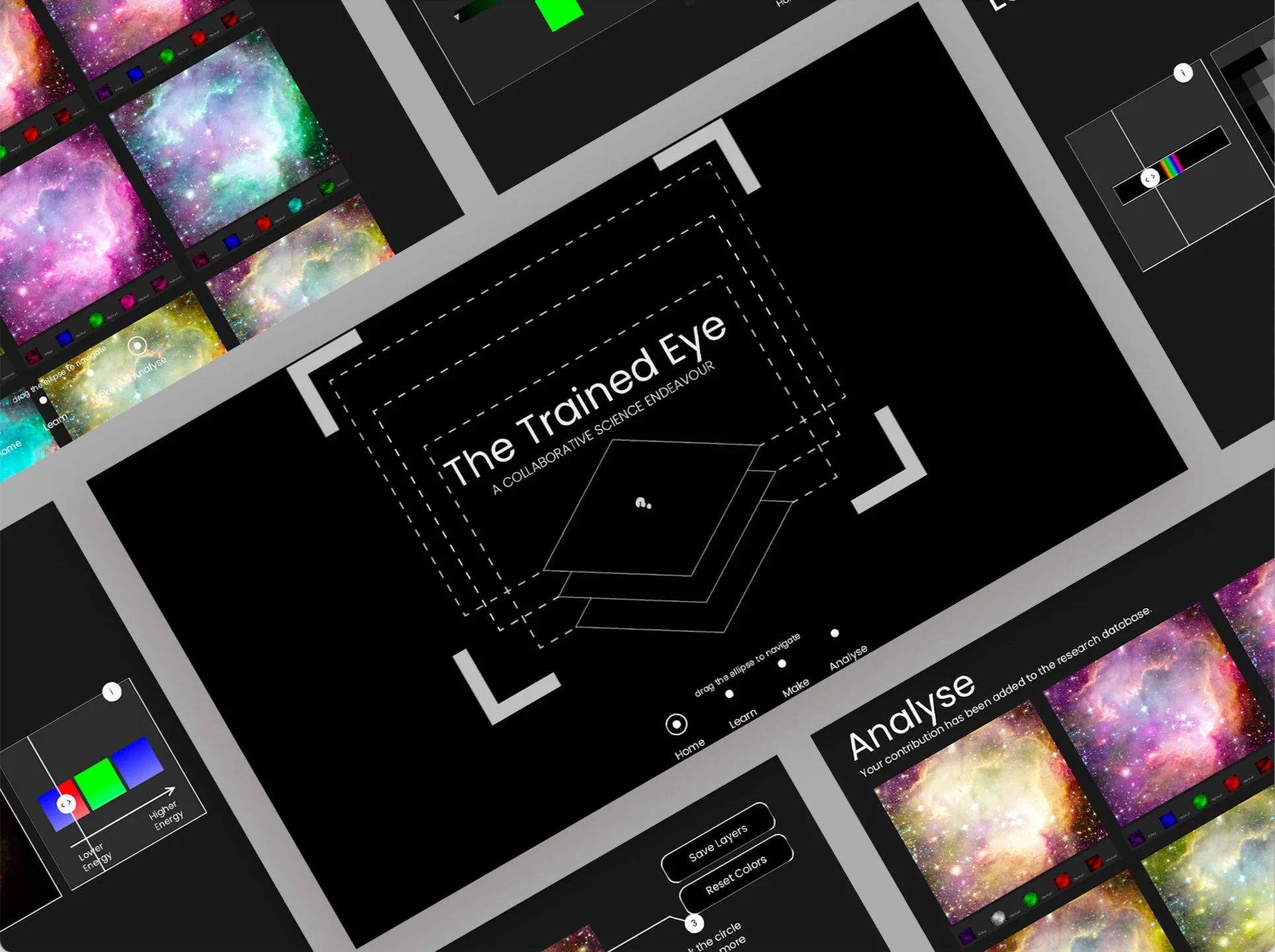 Built entirely in Processing, The Trained Eye is a software proposal that explores astronomical image processing. Using creative computing and progressive disclosure, it speaks to the ways in which design fosters visual literacy and contributes to knowledge consumption and contribution.